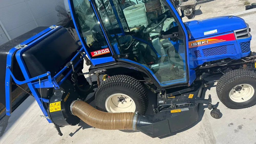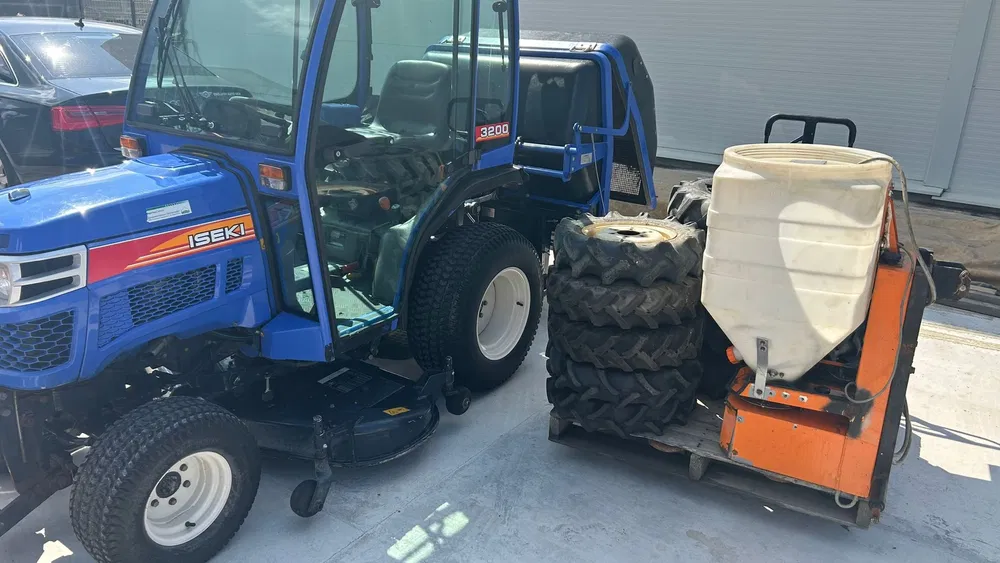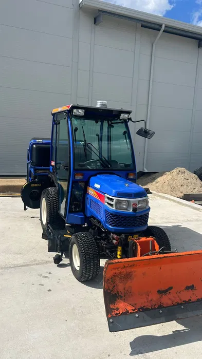 Iseki 4 x 4 tractor, year 2010, 930 hours, with cab, equipped with: lawn mower, grass cutter, bucket, 8 new spare wheels, three new grass cutting blades, perfect working condition, Japanese machine.
